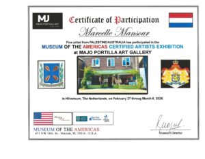 Nov 2025, Marcelle Mansour participated in a group exhibition of certified Artists in Netherlands, organized by the Museum of the Americas, from February 27 through to 6 march 2026 March 2026.