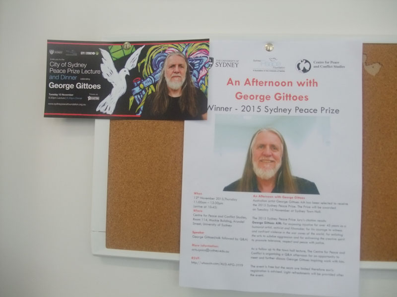 On Thursday 12th November 2015, I was fortunate to be invited by the Centre for Peace and Conflict Studies (CPACS) to attend the event of “An Afternoon with George Gittoes”, which was held at the CPACS Centre at the University of Sydney.