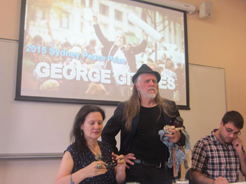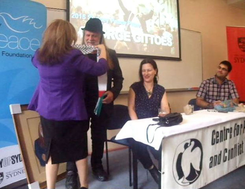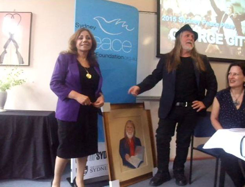 George Gittoes AM is a distinguished Australian and International Visual Artist of War and Peace, Photojournalist and Film Maker, who has been awarded the 2015 Sydney Peace Prize on Tuesday 10 November at Sydney Town Hall. “Australia’s only international peace award, “for exposing injustice for more than 45 years as a humanist artist, activist and filmmaker; for his courage to witness and confront violence in the war zones of the world; for enlisting the arts to subdue aggression and for enlivening the creative spirit to promote tolerance, respect and peace with justice.” The 2015 Sydney Peace Prize Jury’s citation stated. “The Jury felt his unique approach to peacebuilding and social justice should be recognised and applauded.”